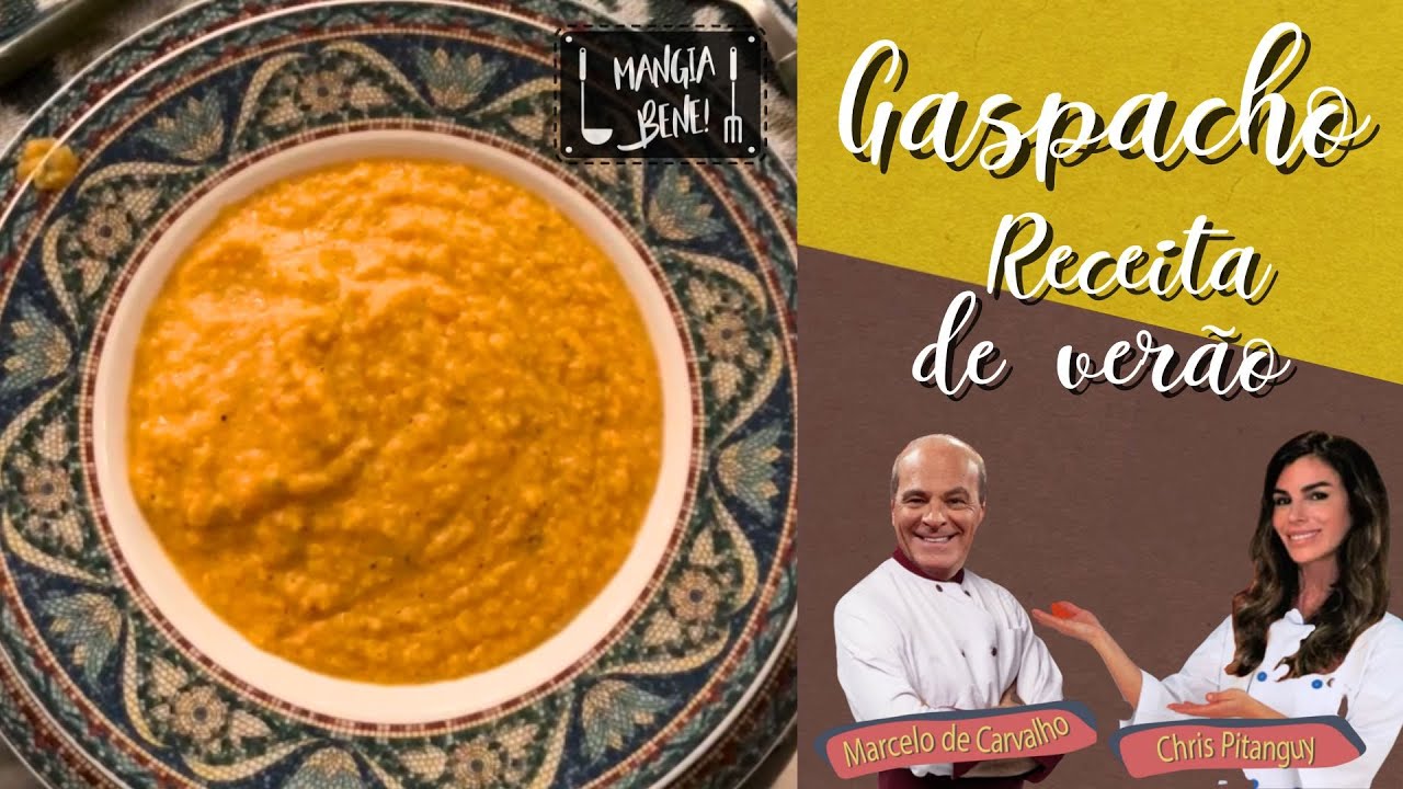 Ingredientes: Tomate (sem a parte de dentro); Pepino; Cebola; Alho; Pimentão vermelho (sem a parte de dentro); Pimentão amarelo (sem a parte de dentro); Pão